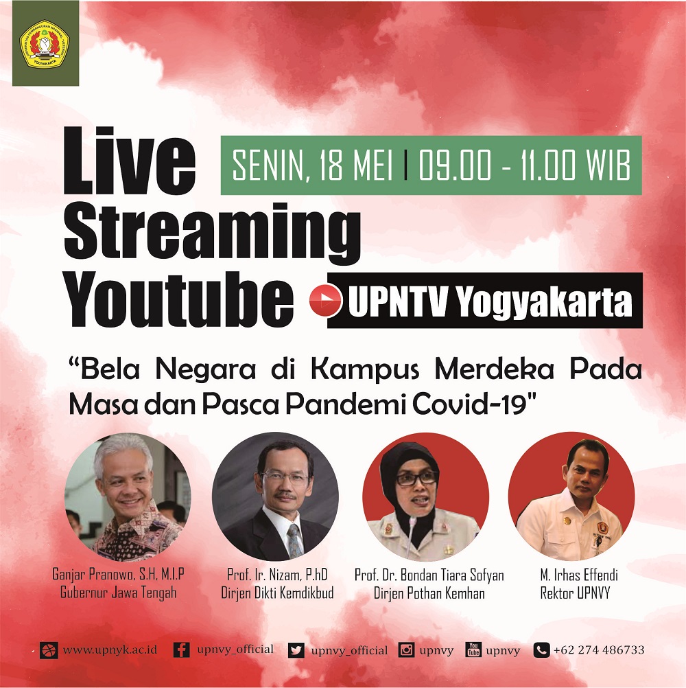 SLEMAN – Tokoh – tokoh nasional paparkan bela negara pada masa dan pasca pandemi Covid-19, Senin (18/5). Gubernur Jawa Tengah, Dirjen Potensi Pertahanan, Dirjen Pendidikan Tinggi dan Rektor UPN “Veteran” Yogyakarta (UPNVY) bergantian menyampaikan paparan dalam Webinar Pekan Bela Negara melalui media daring.